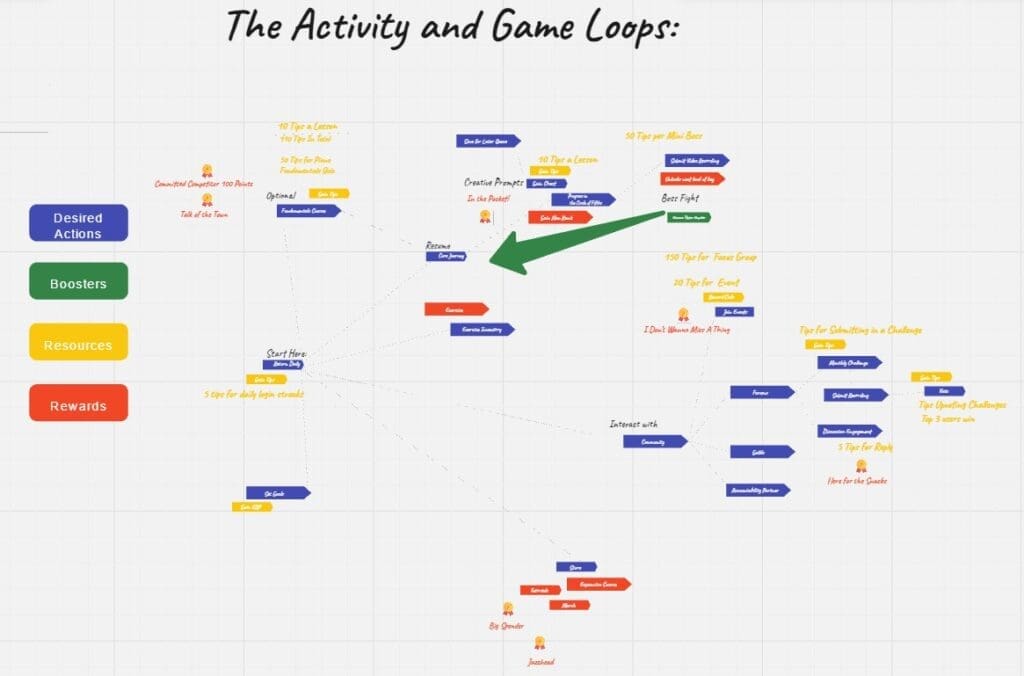 Then we started to connect the dots regarding the challenges, badge systems and point allocation for the virtual economy design.